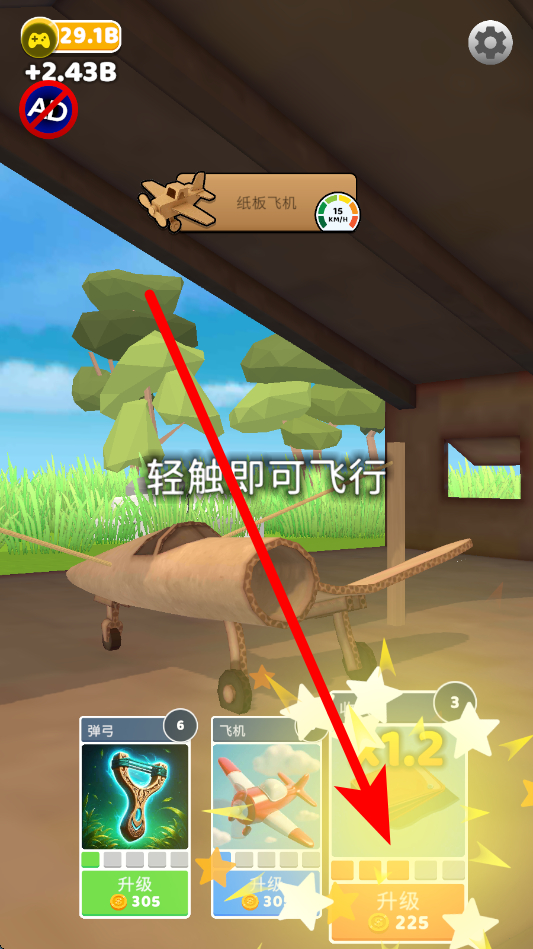 3、接着可以使用内置菜单升级,对飞机弹弓收入等进行升级,消耗相应的金币,提升它们的等级,让飞行等操作更具优势。