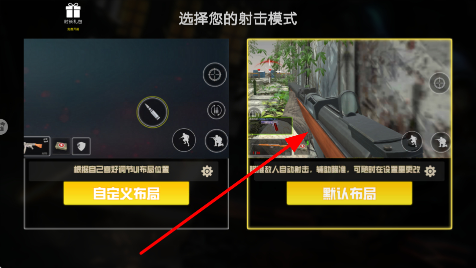 3、在射击模式选择界面,可根据自身喜好,挑选自定义布局或默认布局,调整射击操作的方式,以便更好地进行战斗。