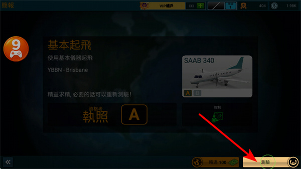 3、在基本起飛考试界面,点击测验按钮,开始使用SAAB 340进行基本起飞的测验,锤炼驾驶技能。