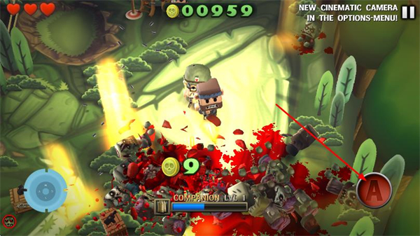 2、点击右侧A键发动攻击,可使用机枪、军刀等武器对僵尸造成伤害。