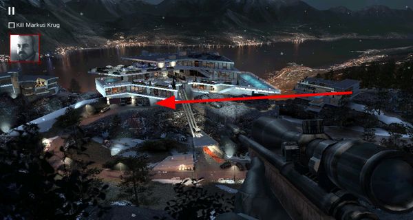 1、左右滑动屏幕旋转视角,全方位观察别墅及周边场景,仔细寻找任务目标所在的位置,为后续狙击行动做好准备。
