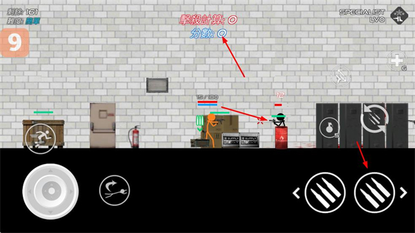 4、进入战斗场景,操控角色射击敌人,积累击杀计数和分数,推进游戏进程。
