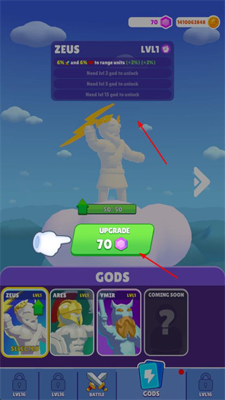 1、升级神祇,提升其等级和战力,为战斗提供强力支持,开启神话主题的攻防对战进程。