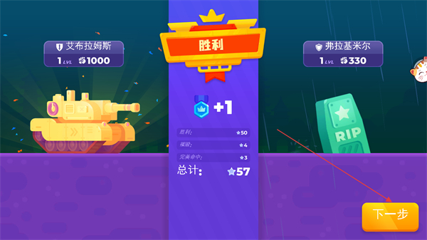 4、击败敌方坦克后,点击下一步按钮,进入下一场对战继续游戏。