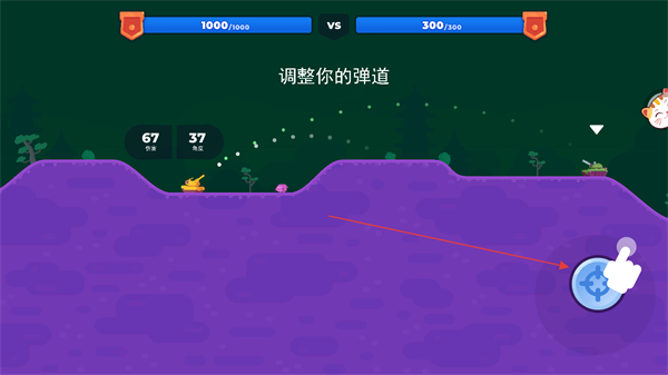 1、进入游戏后,调整右侧弹道控制按钮,注意坦克炮弹的发射轨迹。