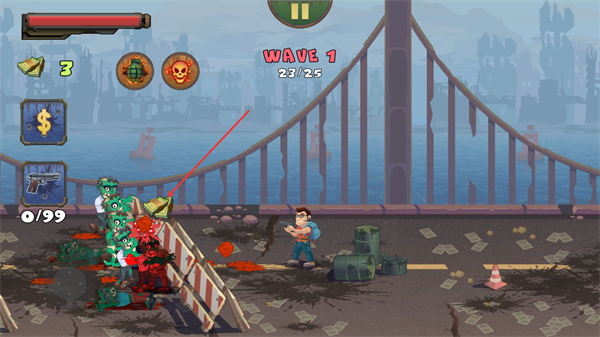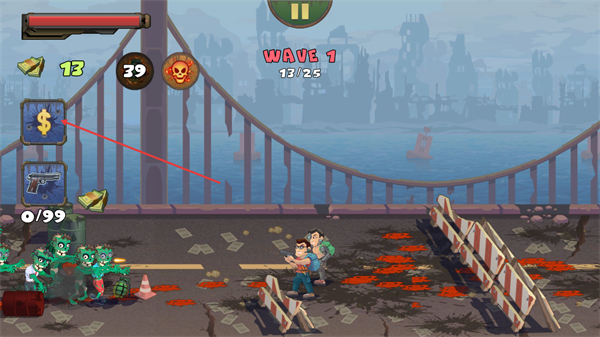 2、在WAVE1进程中,持续击杀僵尸完成25只的目标,同时可通过左侧美元图标管理获取的资源。