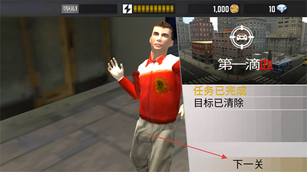 4、射击目标后显示任务已完成,点击下一关推进游戏流程。