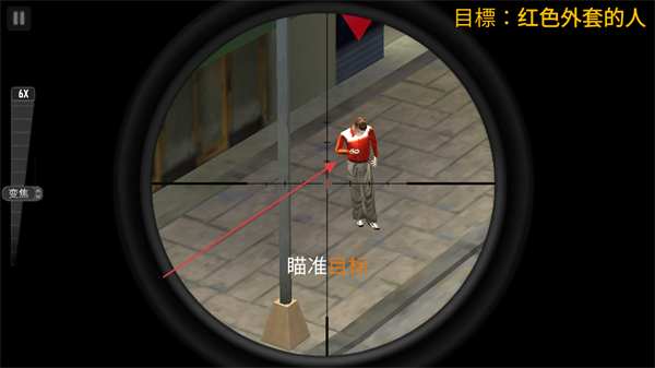 2、在场景中识别红色外套的人,按提示确认其为目标,准备狙击。