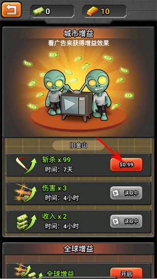 4、在城市增益界面,花费$0.99可获得新杀×99的增益效果,持续7天,大幅提升战斗效率。
