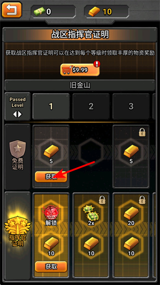 1、在战区指挥官证明界面,点击获取按键,可领取对应等级的金条奖励,积累资源助力游戏进程。