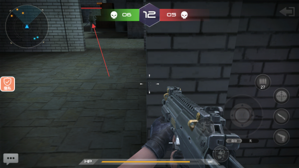 2、对战开始后,进入战斗场景,借助左侧小地图判断局势,手持枪械在有砖墙的环境中移动,留意画面上方的双方击杀数,寻找敌人位置并做好对峙准备。
