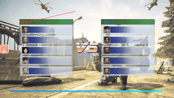 1、进入游戏对战准备界面,查看红色方与蓝色方的阵营角色,确认己方所在阵营,等待对战正式开始,期间可观察背景中的战斗元素如直升机等,提前熟悉对战氛围。