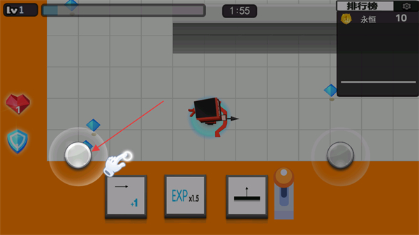 3、点击右侧按钮控制角色移动,收集红色爱心道具,恢复生命值,继续参与对战。