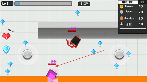 4、升级后解锁新武器,收集红色爱心和蓝色钻石,提升战力,在排行榜中争取更高名次。