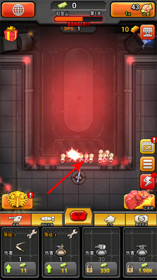 2、点击下方士兵等级提升的绿色箭头按键,升级士兵可提升伤害,增强应对僵尸的作战能力。