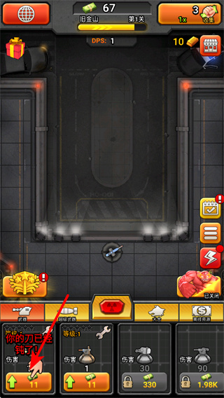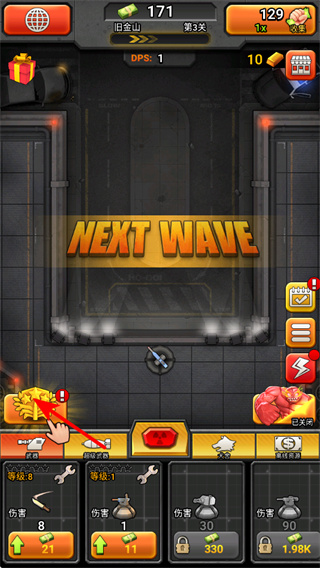 4、点击左侧的金色奖励按键,领取关卡奖励,获取资源用于提升士兵或武器,助力后续战斗。