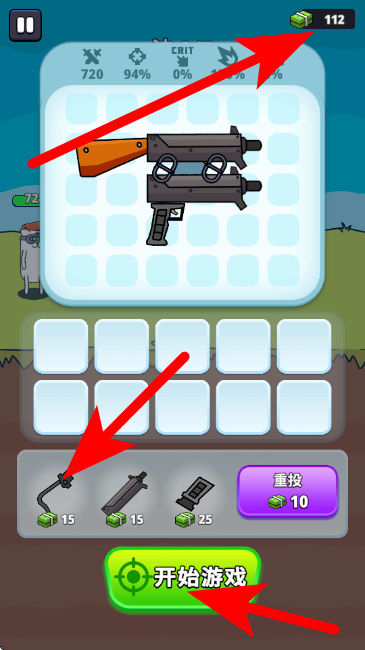 4、使用金币选择新的枪械部件组装,点击开始按钮,进入下一波对战。