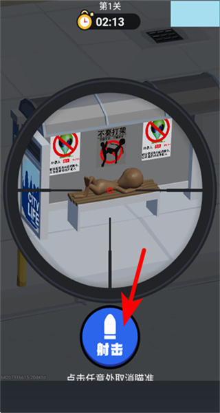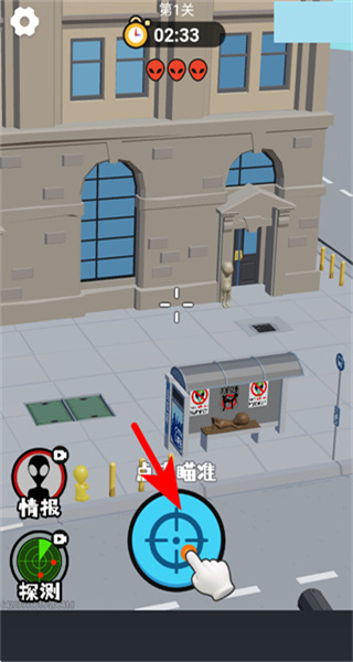 4、按照箭头指引,瞄准长椅上的伪装目标,点击射击按钮,可清除该隐藏的外星人。