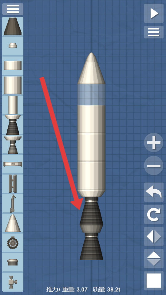 2、继续在建造界面,添加火箭发动机部件,提升火箭的推力或者重量比,确保火箭具备足够的动力进行发射。