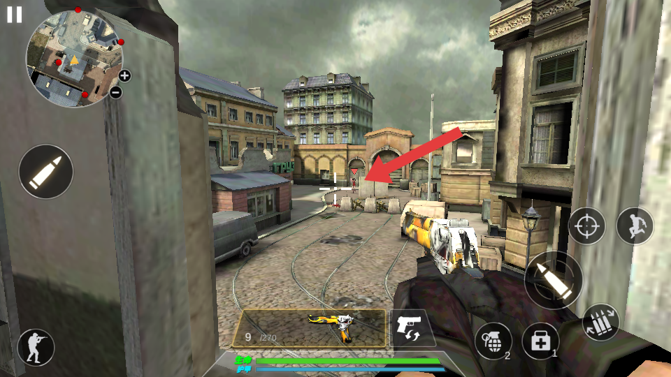 1、在城市街道场景中,瞄准箭头指向的远处目标区域,准备发起攻击,利用武器火力对目标造成伤害,推进战斗进程。
