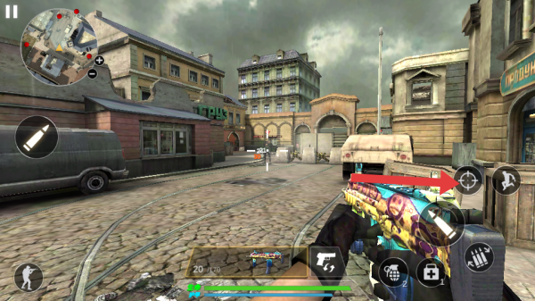 4、需要更精准打击远处目标时,点击箭头指向的瞄准按键,开启瞄准模式,精准锁定目标,发起有效攻击。