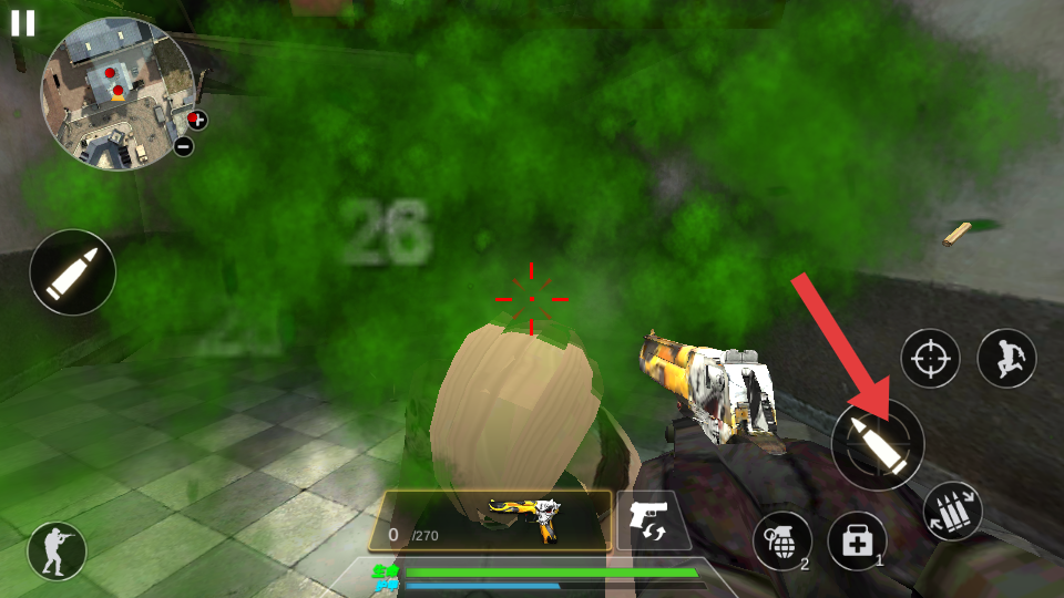 2、参与者遇到近距离敌人时,点击箭头指向的武器攻击按键,向敌人开火,快速消灭敌人,保障自身的安全。