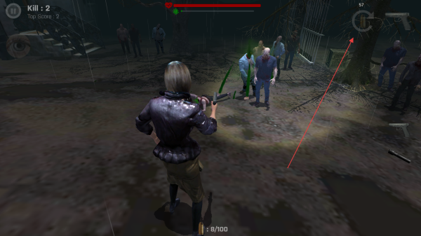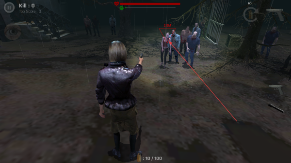 3、进入场景后,留意周围出现的僵尸,通过操控角色移动来躲避僵尸的攻击,并对准僵尸射击。