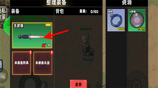 4、进入整理装备界面后,将获取的武器装配至主武器栏,这是强化角色战力的重要操作,装配后武器会生效,提升角色生存场景中战斗能力。