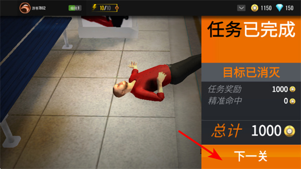 4、任务完成后点击下一关按钮可进入新的狙击任务,是持续推进游戏进程的关键操作,需适应新的场景类型。