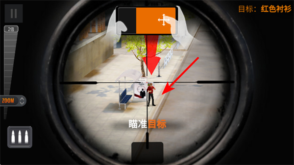 2、通过瞄准镜瞄准目标人物,确保十字准星对准目标,这是有效击中目标的关键操作,注意目标的移动状态。