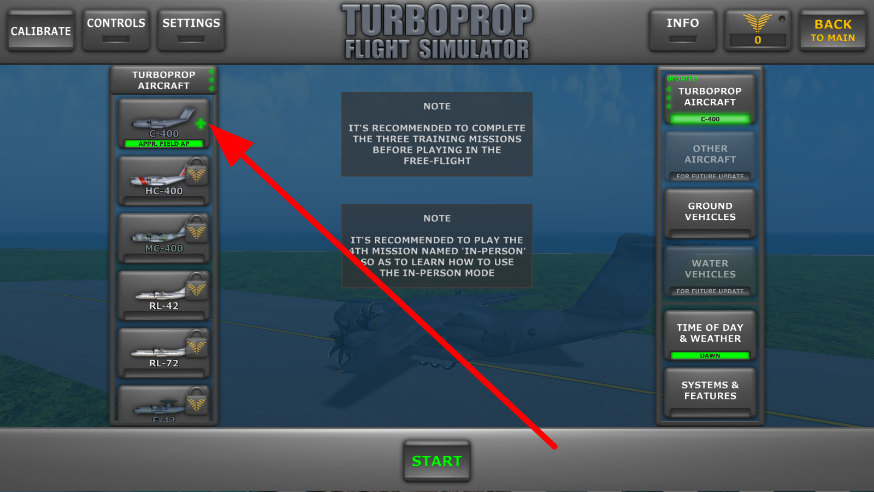 1、开局游戏进入选择界面,会看到多种型号的飞机,如C400等,从中挑选想要驾驶的飞机,选好后点击开始进入飞行场景。