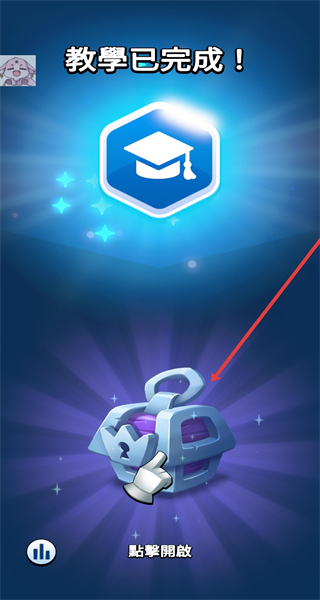 4、在教学关卡完成后,点击开启宝箱,获取资源道具,进入后续游戏关卡。