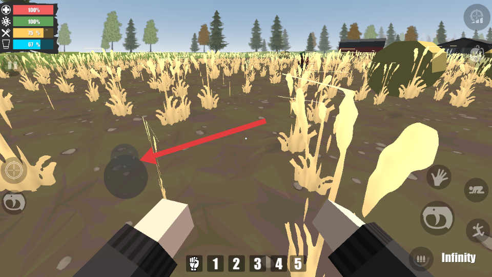1、在野外场景中,通过箭头指向的虚拟摇杆,操控角色在草地等区域移动,探索周围环境,寻找资源或目标。