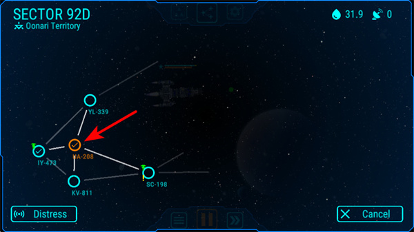 1、在星际地图中,点击橙色标记的区域可前往执行任务,需关注任务类型和自身飞船的准备状态,确保任务执行。