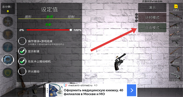 2、在设置界面,点击“自由模式”按钮,开始进行左轮手枪的组装操作。
