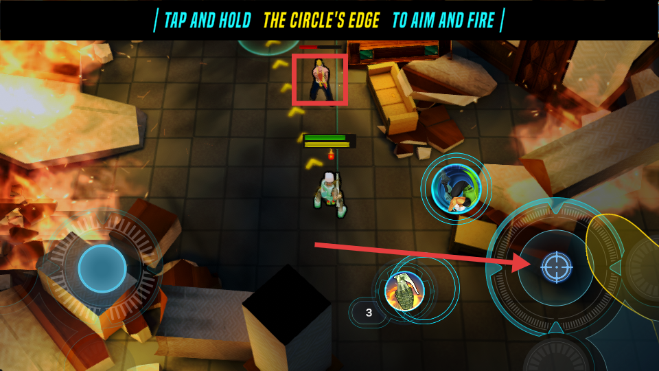 3、点击并按住右侧的射击按钮,可以进行边瞄准边移动的方式来开火,精准打击目标。