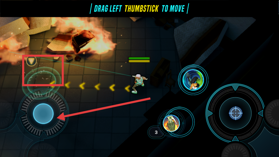 2、拖动左侧的虚拟摇杆来控制角色移动,根据场景中火焰等元素,灵活调整移动方向,避开危险区域前往目的地。
