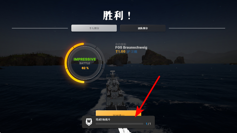 4、战斗胜利后关注任务进度条,完成如完成1场战斗的任务可获取奖励,完成后可用于升级舰艇或解锁新武器。