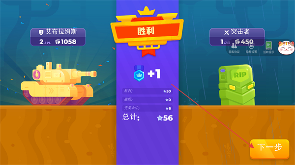 4、消灭敌方坦克后,获得胜利奖励,点击下一步继续挑战后续关卡。