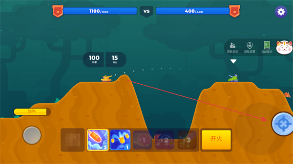 2、点击开火按钮发射炮弹,攻击敌方坦克,逐步消耗其血量。