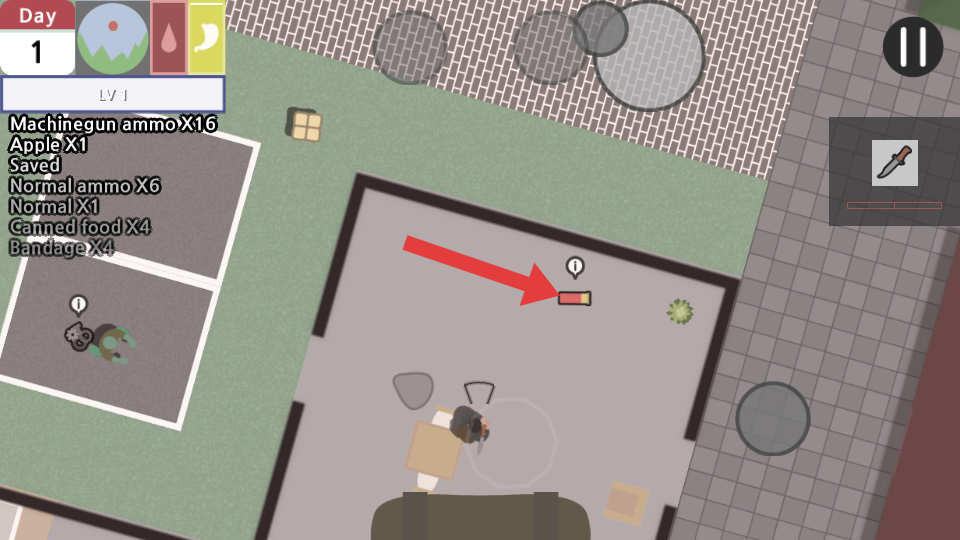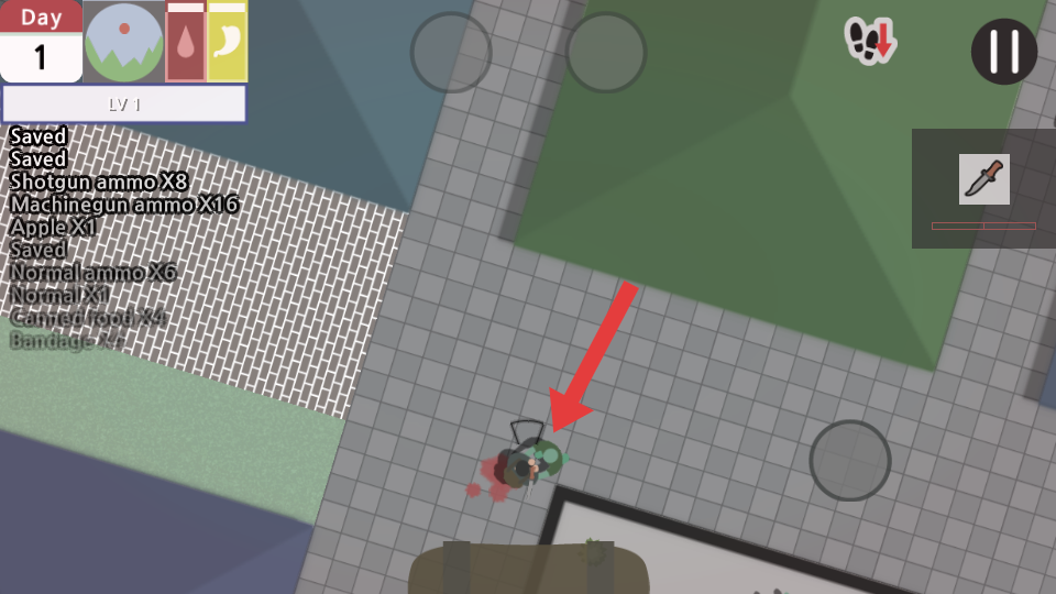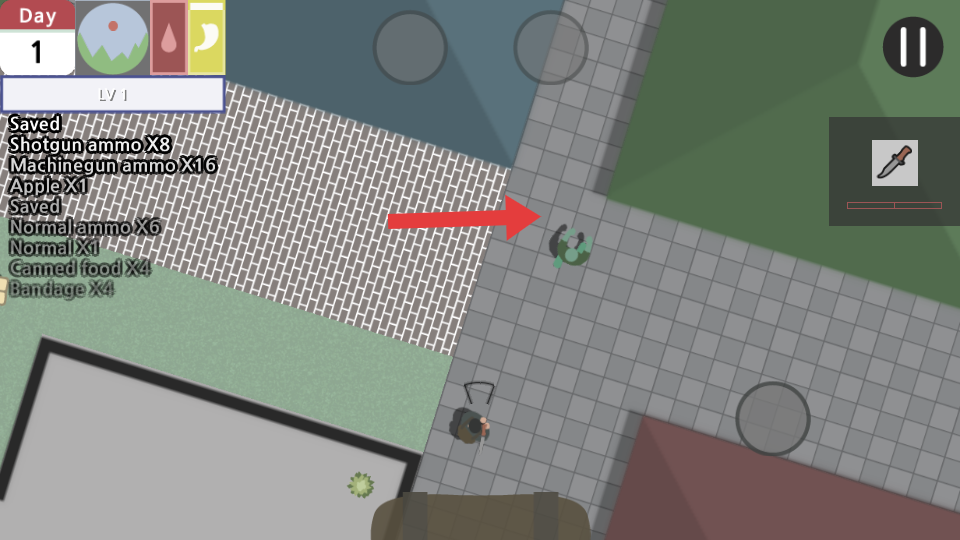 2、基础操作与探索:通过左侧控件控制角色移动,在场景中探索收集材料,右侧控件用于发动攻击,借助上帝视角观察丧尸位置,提前规划路线规避不必要的冲突。