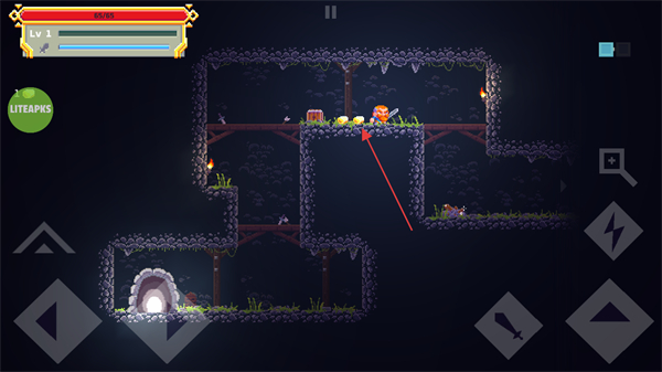 1、通过左下角的方向键操控矮人角色在洞穴场景中移动,探索不同区域,寻找宝箱和资源。