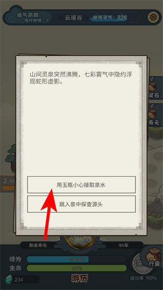 3、遇到山间灵泉相关的选择界面时,点击用玉瓶小心摄取泉水选项,获取资源核操作,可获得对应的道具,助力修行或兑换奖励。