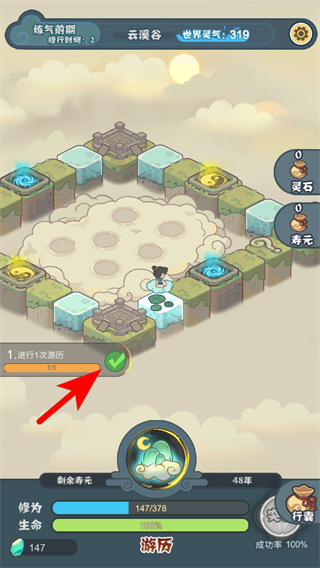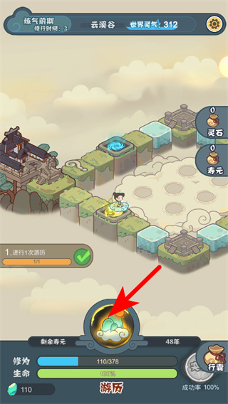 1、在主界面点击游历按钮,这是推进修行流程的关键操作,点击后角色会进入游历场景,获取修为、资源等成长所需的材料。