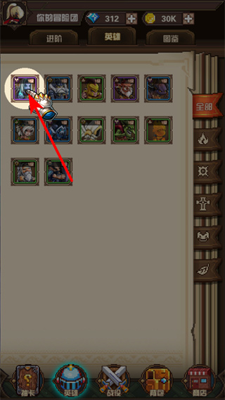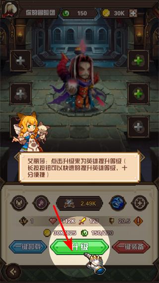 3、点击英雄卡片可进入英雄管理界面,进入后可以查看英雄的属性和技能,为英雄升级、进阶,提升英雄战力。