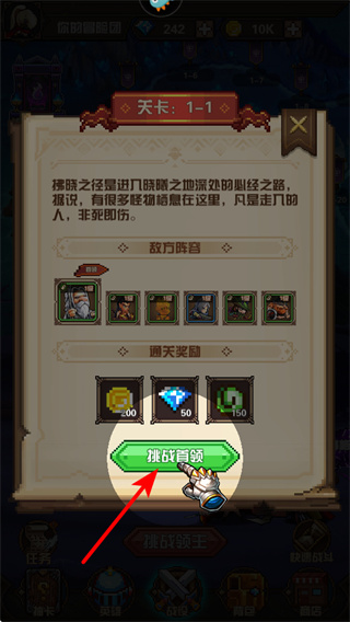 1、挑战首领可进入关卡,进入前可查看敌方阵容和通关奖励,结合自身战力判断是否挑战,挑战成功后获取金币。