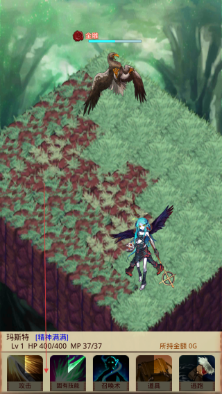 4、在战斗场景中,根据情况选择攻击,固有技能,召唤术,道具,逃跑等指令,与魔物战斗并获取胜利。
