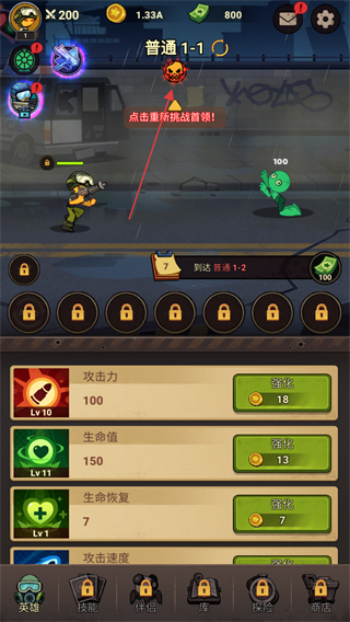 3、处于普通1-1界面,完成属性强化后,点击重新挑战首领按钮推进战斗,以此达成到达普通1-2的任务要求。