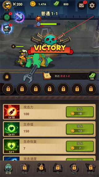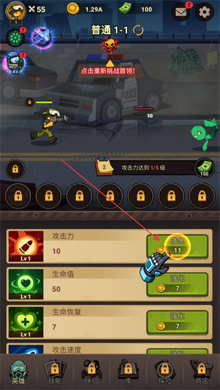 2、在普通1-1关卡界面,按指引点击强化按钮提升攻击力,助力完成攻击力达到1/5级的目标。