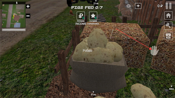 3、当前任务为喂食7头猪,点击右侧手掌拾取界面中的Potato作为饲料,这是完成喂食任务的必要步骤。